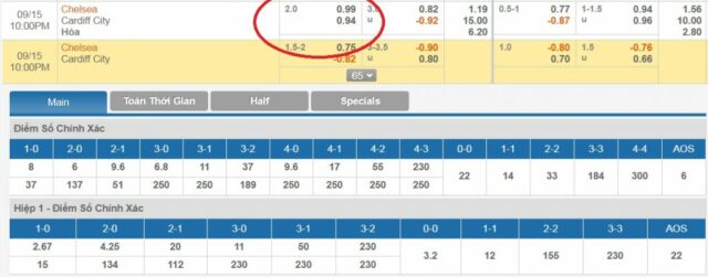 Trong trường hợp trận đấu giữa Chelsea và Cardiff City, giả sử người chơi chọn đặt cược vào đội cửa dưới Cardiff City với số tiền 100 đô. Nếu kết thúc trận đấu, đội đầu bảng Chelsea thắng cách biệt 2 bàn (2-0, 3-1, 4-2, …) sẽ được tính là hòa. Khi đó, người chơi chọn cửa trên hoặc cửa dưới sẽ được hoàn trả số tiền 100 đô đã đặt cược.